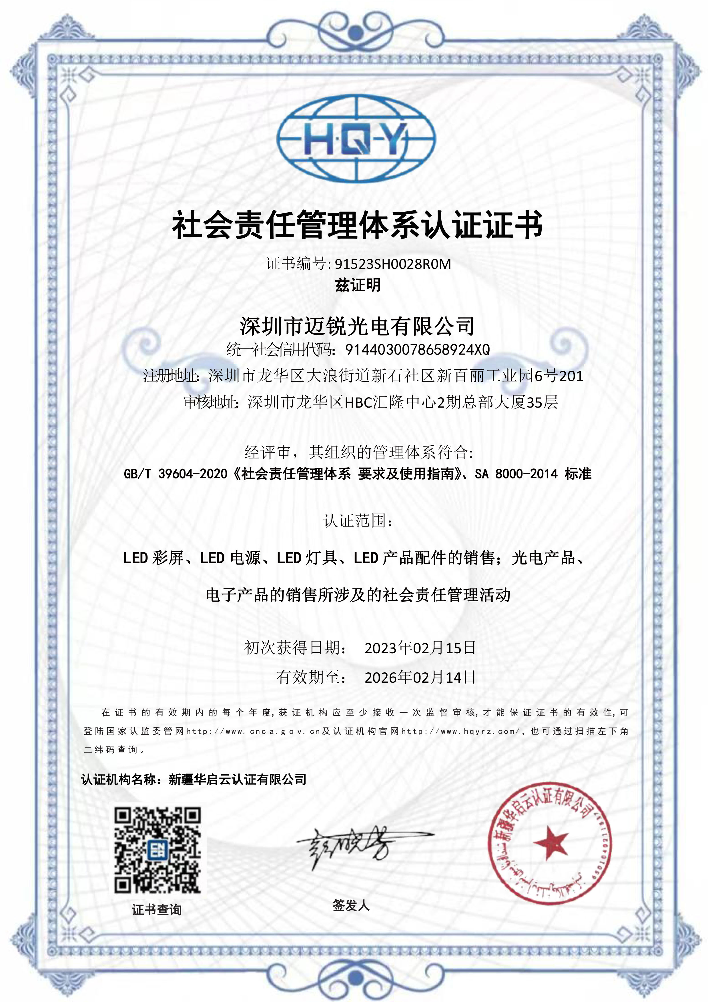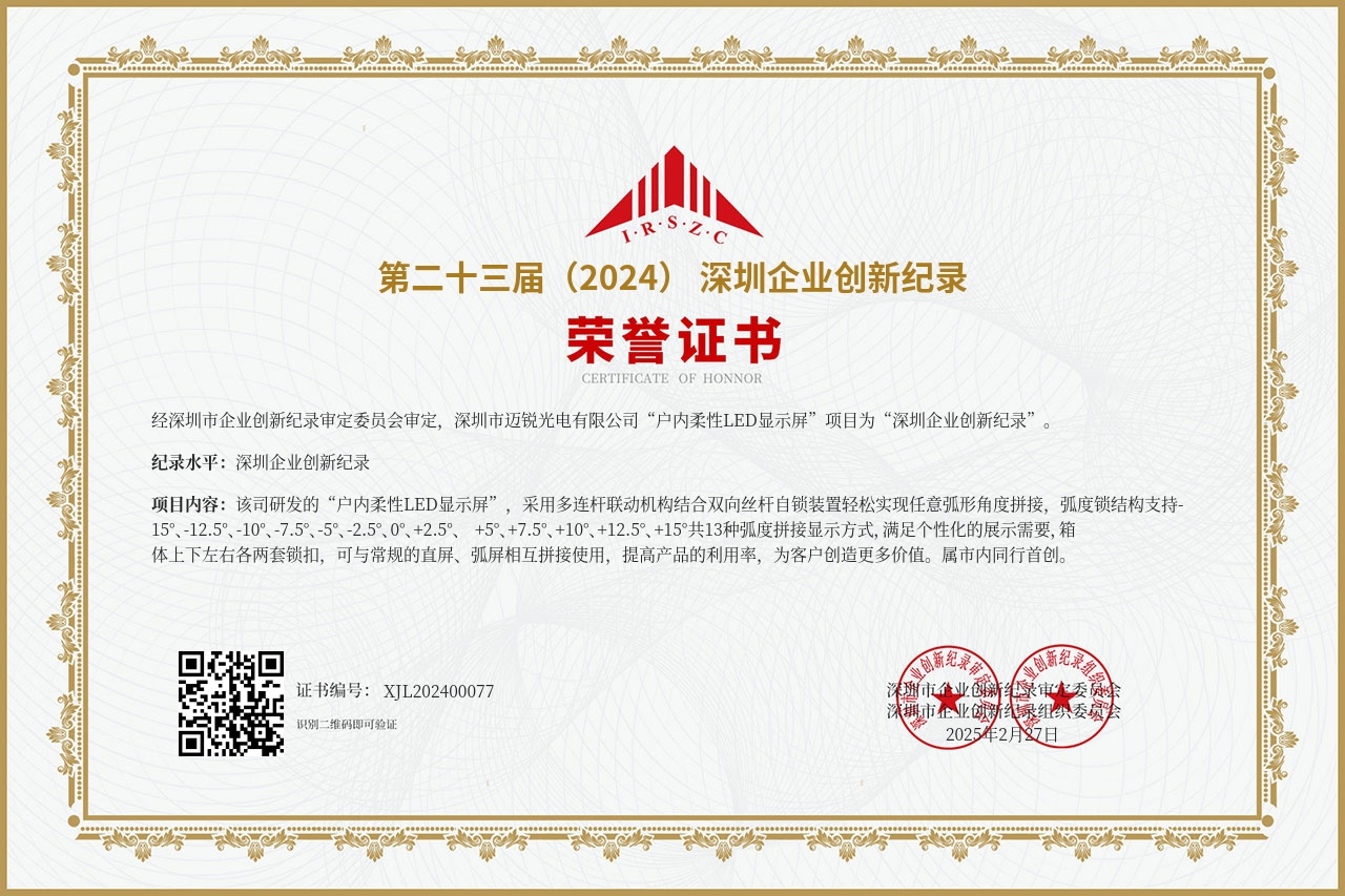 2013年9月,邁銳光電正式成為“福日電子”(證券代碼600203)控股企業(yè),自此開啟規(guī)范化發(fā)展新階段。憑借過硬的品質(zhì)與口碑,先后獲得“全國百佳質(zhì)量誠信標(biāo)桿企業(yè)”、“全國質(zhì)量信?先進(jìn)企業(yè)”、“全國LED顯?屏?業(yè)質(zhì)量領(lǐng)先企業(yè)”等榮譽(yù),并通過了ISO質(zhì)量管理、環(huán)境管理、職業(yè)健康管理、兩化融合管理、知識產(chǎn)權(quán)管理、社會責(zé)任管理等多體系認(rèn)證,構(gòu)建起全維度的管理規(guī)范。在產(chǎn)品認(rèn)證方面,不僅通過了CCC、FCC、CE、ETL等國際權(quán)威檢測認(rèn)證,還獲得中國節(jié)能產(chǎn)品、中國環(huán)保產(chǎn)品、中國綠?節(jié)能環(huán)保產(chǎn)品等環(huán)保節(jié)能認(rèn)證,彰顯技術(shù)實(shí)力與責(zé)任擔(dān)當(dāng)。